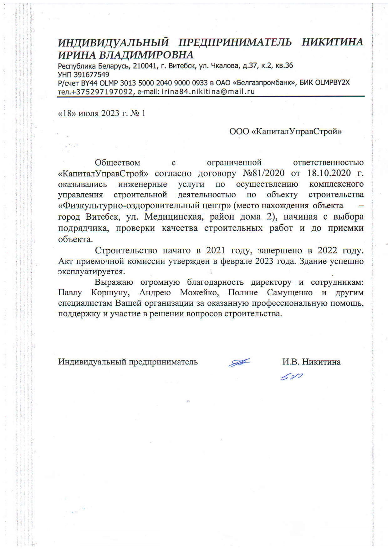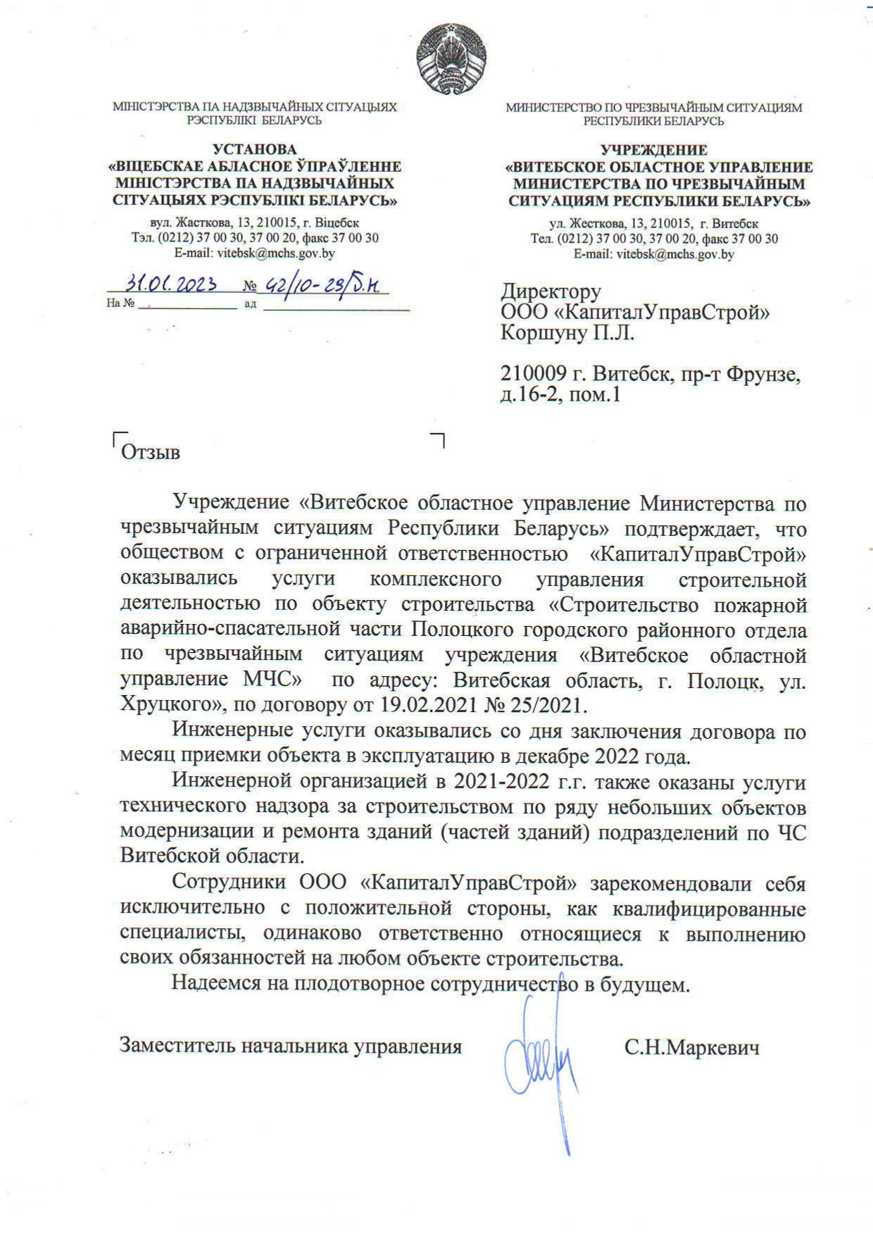 В 2023 году с нашим участием завершена реконструкция здания Большой Любавичской синагоги по ул. Революционной, а также модернизация фасадов здания Витебского областного управления МЧС по ул. Жесткова (второй пусковой комплекс) в городе Витебске, реализован проект "Модернизация помещений части здания Витебского филиала РУП "Белпочта", расположенного по адресу: г. Витебск, ул. Ленинградская, 84А/1".