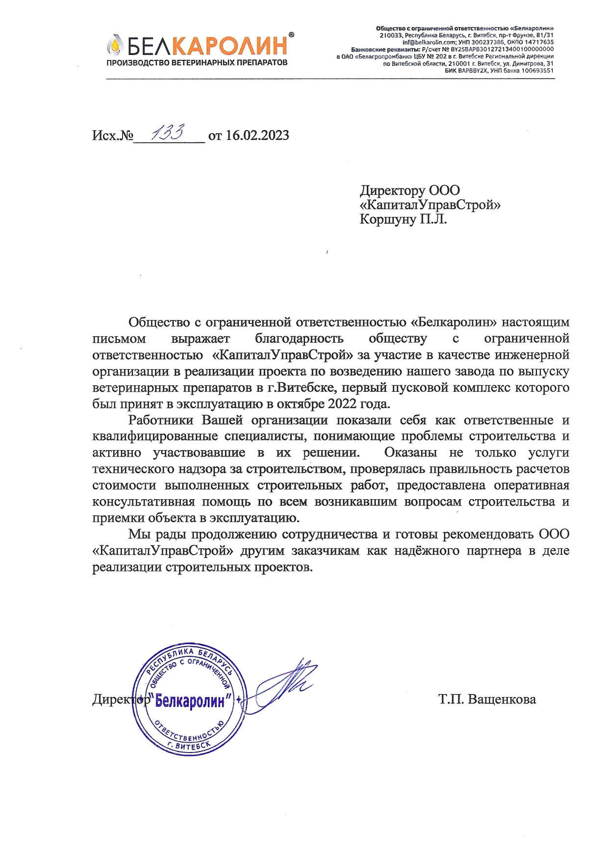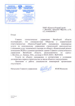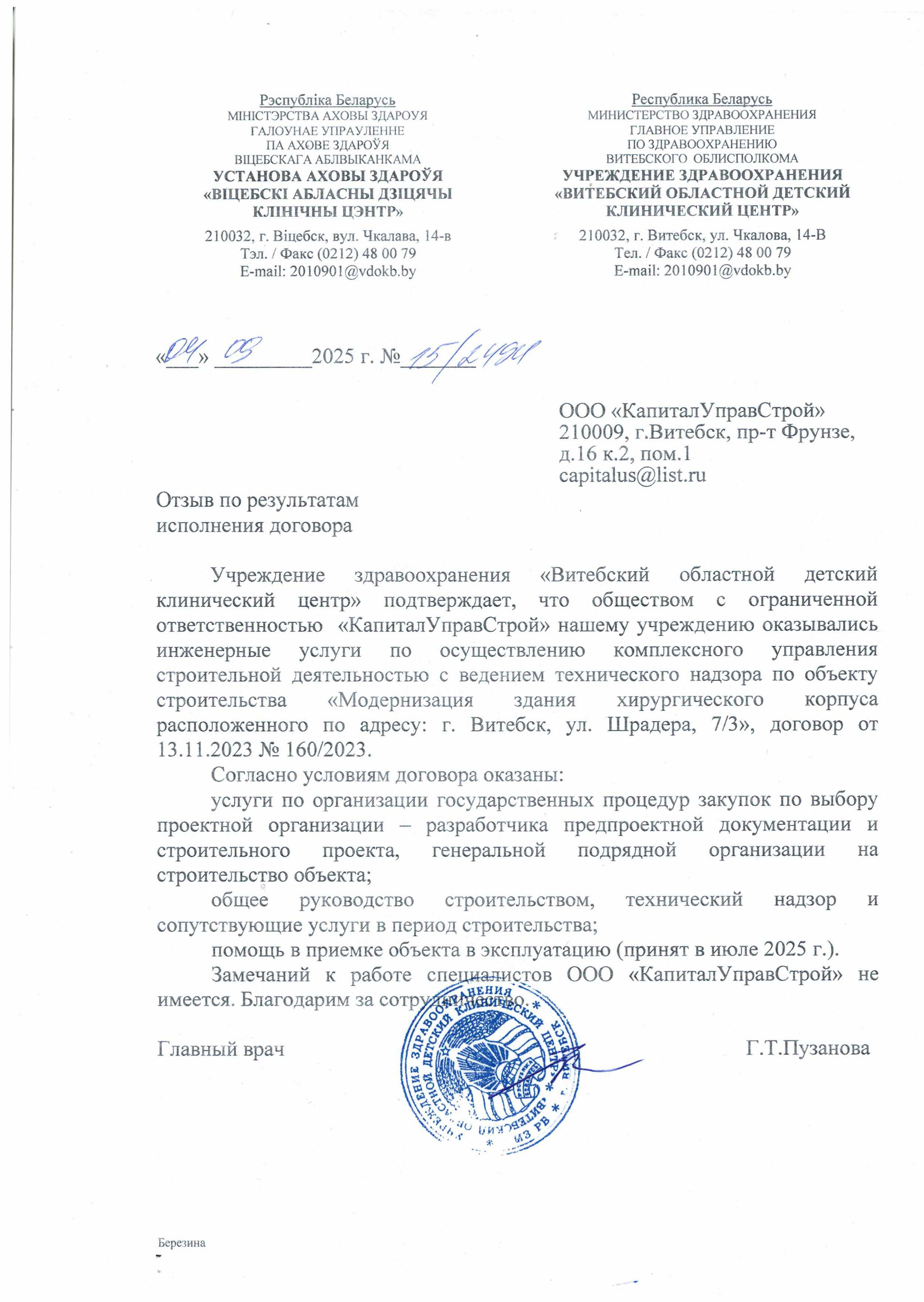 В 2024 году в рамках комплексного управления реализовано более двух десятков разнообразных "мини"-проектов, среди которых реконструкция здания в г.Верхнедвинске для Главного управления юстиции Витебского облисполкома, техническая модернизация Оршанского цеха УП "Витебсквторчермет", капремонт отдельных помещений Главного статистического управления Витебской области, модернизация помещения зонального архива в г. Орша, капремонт здания склада сбыта ОАО "ВЗТЗЧ", капремонт здания Витебского отделения БелТПП. Специалисты организации осуществляли технический надзор при возведении объектов УП "Витебскоблгаз" на базе Бешенковичского РГС (автомобильная парковка, навес для хранения автотракторной техники, местная линия электропередачи с благоустройством территории), автоматизированной мойки самообслуживания на базе Бешенковичского РЭС (заказчик - РУП "Витебскэнерго"), а также работали на множестве других объектов строительства Витебской области.