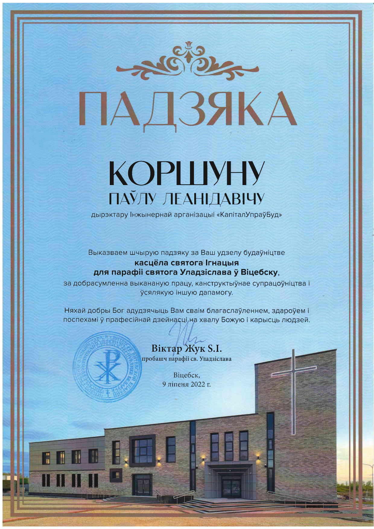В 2022 году завершено возведение с приемкой в эксплуатацию объектов: "Костёл в микрорайоне Билево", "Завод ветеринарных препаратов по ул. 1-я Журжевская" (1-й пусковой комплекс), "Физкультурно-оздоровительный центр по ул.Медицинской, в районе дома 2" (все - г.Витебск), "Пожарная аварийно-спасательная часть по ул. Хруцкого" (г.Полоцк).