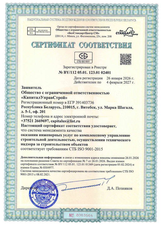 В 2025 году специалисты технического надзора были задействованы на объектах ОАО "Витебская бройлерная птицефабрика", УП "Витебскоблгаз", Витебского предприятия котельных и тепловых сетей, РУП "Витебскэнерго", ОАО "Веста". При комплексном управлении строительной деятельностью приняты в эксплуатацию объекты ООО "Рубикон" (в т.ч. «Возведение линии электропередач от ГРУ-3 Витебской ТЭЦ до существующей ТП-3 ООО «Рубикон» по адресу: г. Витебск, ул. М. Горького,62Б»), ОАО "Витебский МЭЗ" («Возведение сенажно-силосных траншей по адресу: Лиозненский район, аг. Бабиновичи, ул. Оршанская, д. 35А» и др.), реконструкция здания учебно-спортивного комплекса Витебского училища олимпийского резерва, капитальный ремонт здания Государственного зонального архива в г. Полоцке,модернизация здания воспитательно-оздоровительного лагеря "Озёрный" (Ушачский район, аг. Ореховно) и ряд других объектов с государственным финансированием и частными инвестициями.